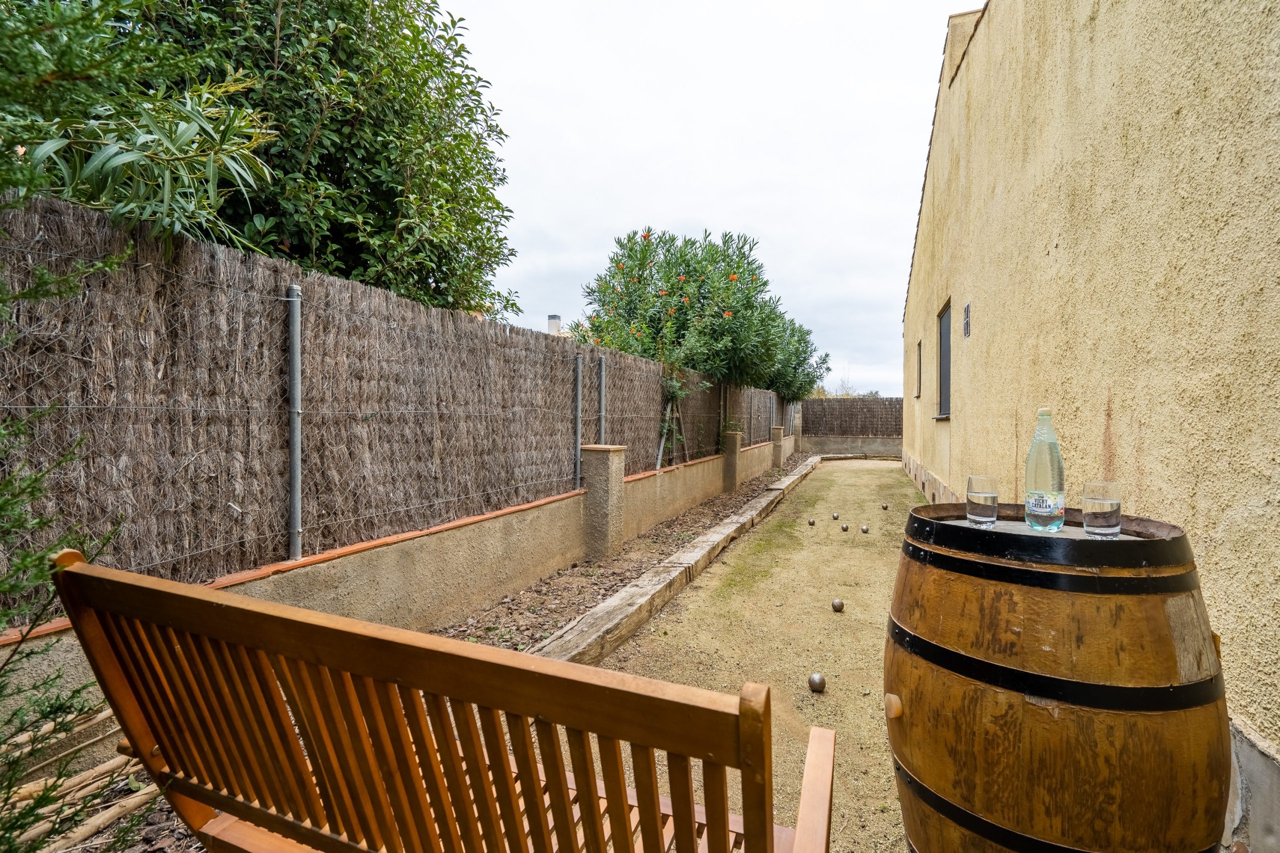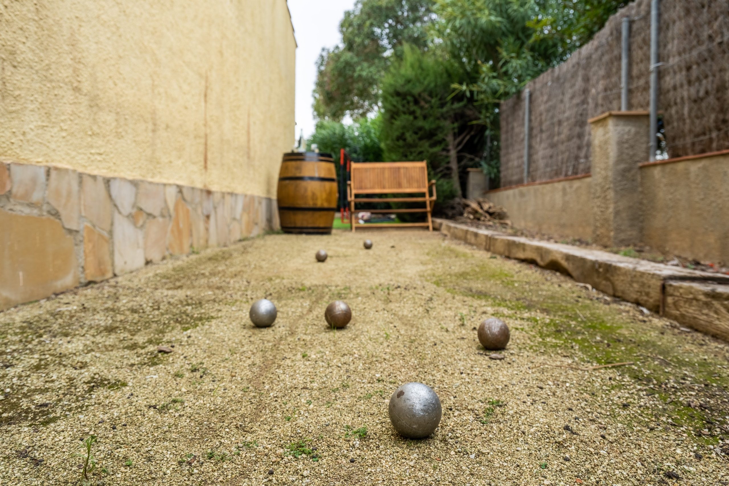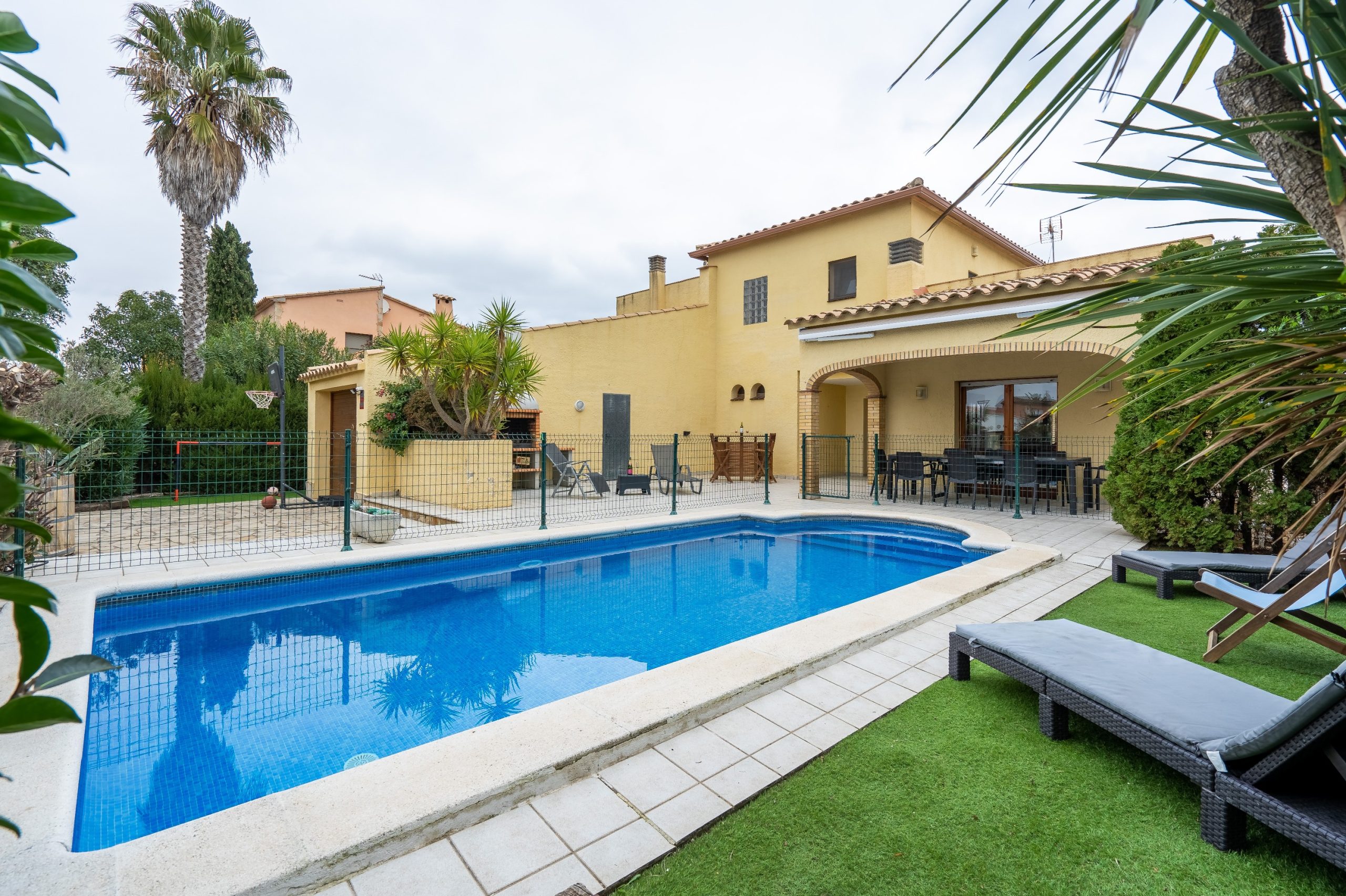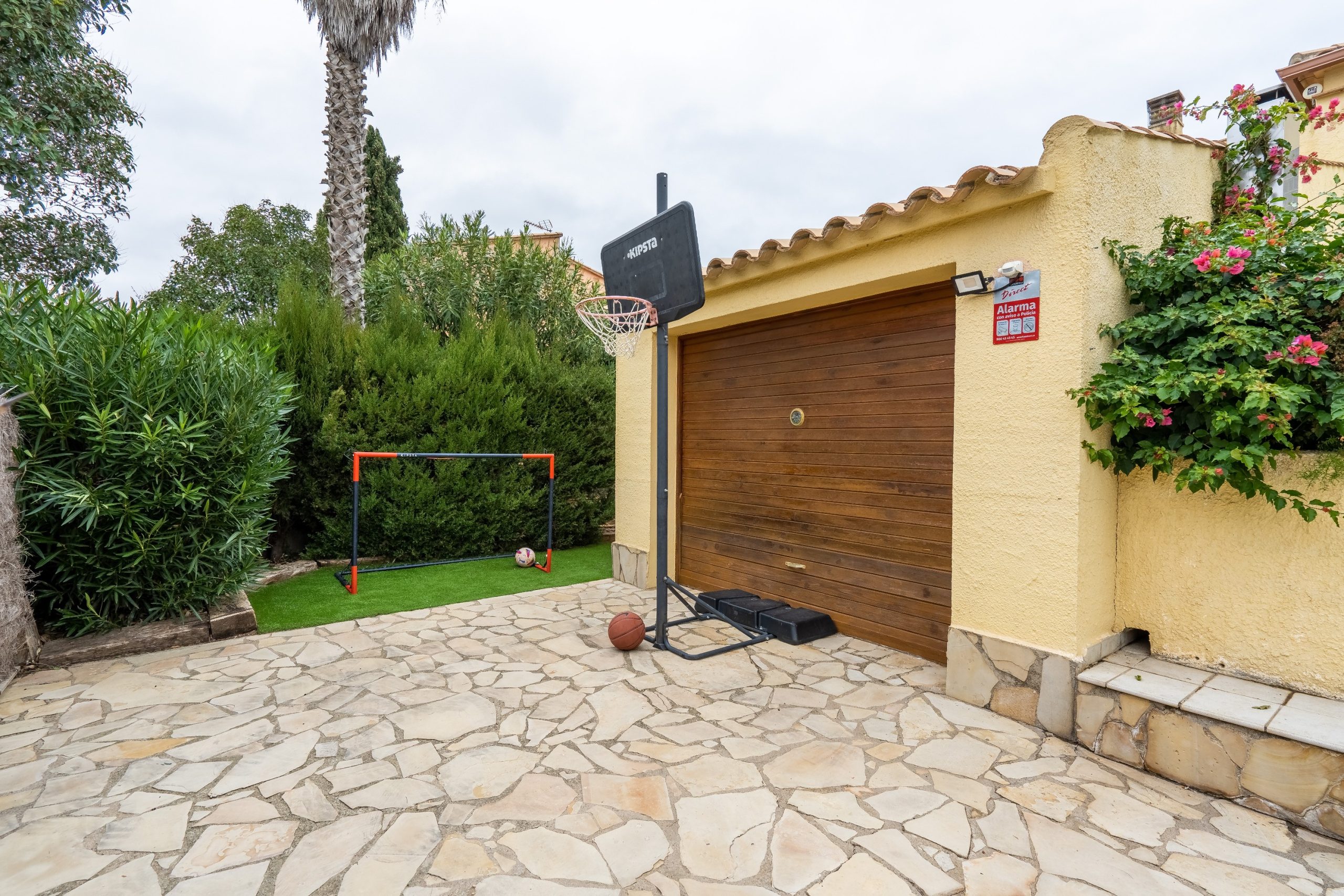 A l’extérieur de la maison, vous profiterez du jardin (fermé pour la sécurité des plus petits) avec sa grande terrasse, du barbecue, de la piscine et de l’aire de jeux et pétanque. Le salon de jardin vous permettra de manger dehors et de vous reposer sur les transats ou fauteuils. La maison dispose également d’un garage pour une voiture, mais les voitures peuvent également être garées à l’extérieur. Dans le garage, il y a un lave-linge et un étendoir.