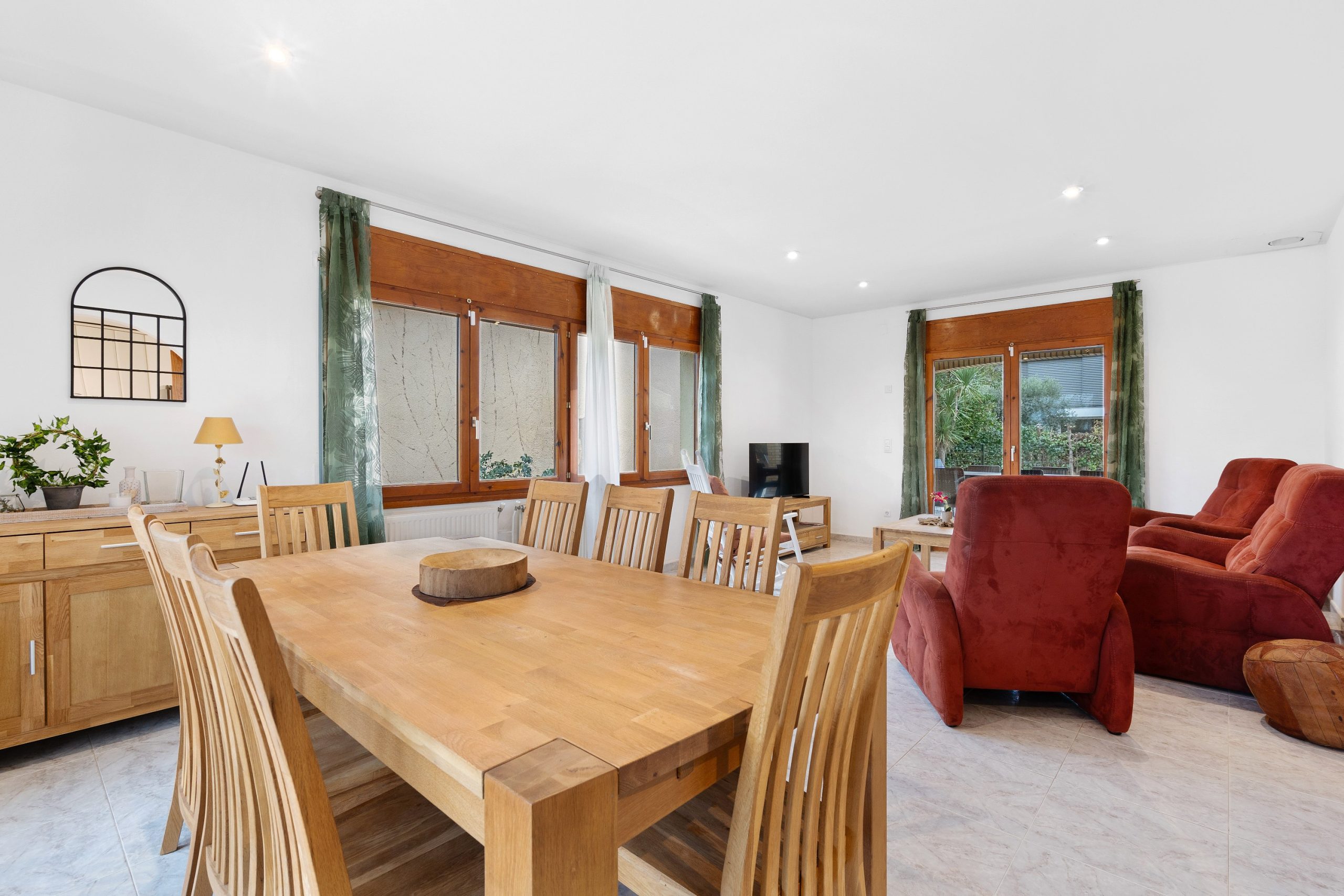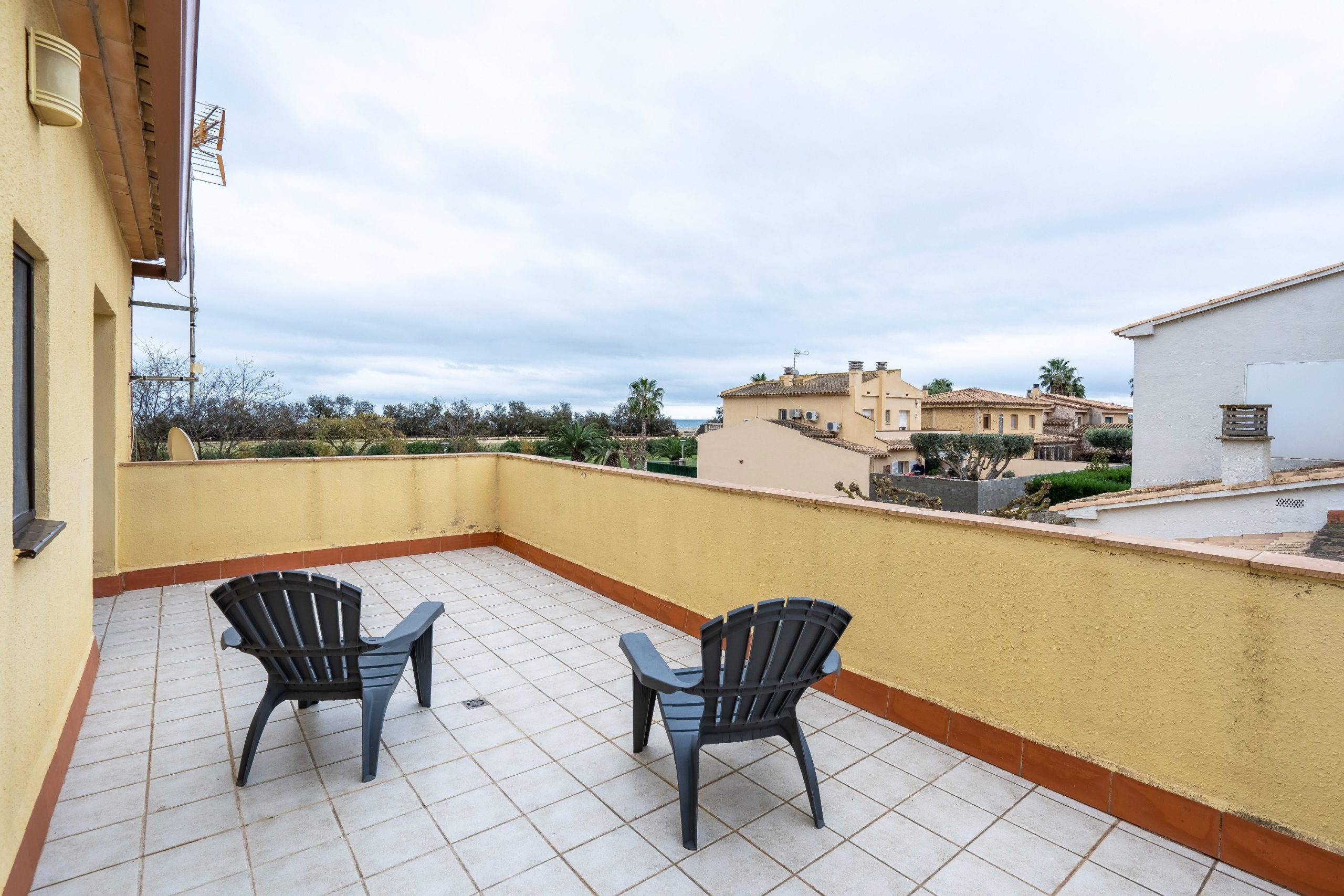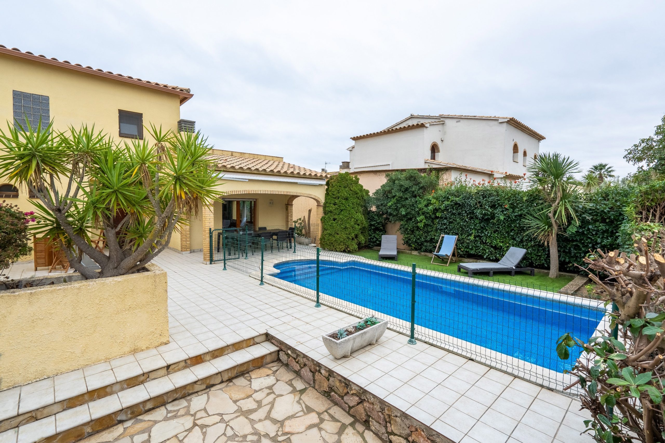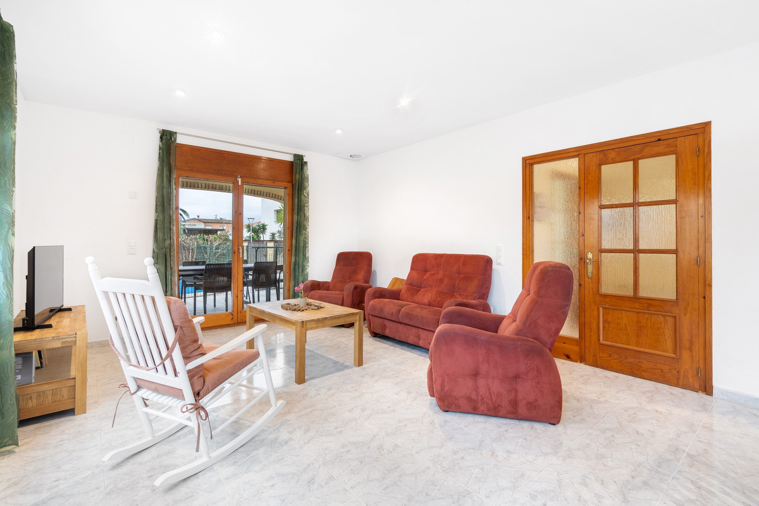 A l’extérieur de la maison, vous profiterez du jardin (fermé pour la sécurité des plus petits) avec sa grande terrasse, du barbecue, de la piscine et de l’aire de jeux et pétanque. Le salon de jardin vous permettra de manger dehors et de vous reposer sur les transats ou fauteuils. La maison dispose également d’un garage pour une voiture, mais les voitures peuvent également être garées à l’extérieur. Dans le garage, il y a un lave-linge et un étendoir.